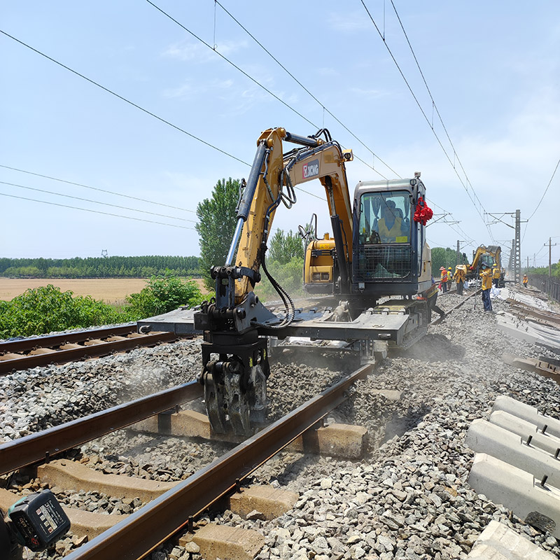 2022-11-15铁路枕木更换机又叫轨道换枕夹具是山东铁推铁路工程有限公司专业生产、改装的一款针对于铁路施工的设备,铁路枕木更换机主要是运用挖掘机进行底盘的改装,在保证原有挖机结构不边的情况下在底盘加装前后升降支架并且安装驱动轮行驶轮,实现了挖掘机可以在道轨上行驶的要求,保证挖掘机的运行不会出现跑偏、掉道等情况。其次在挖掘机属具的安装上前段配备360°可旋转枕木夹具及28000mm道砟刮板,主要是为了满足枕木的抽取和更换,360°夹具能够更灵活的实现作业的要求。大刮板的配备主要是为了清理道芯内的道砟及板结,能够更有效的实现作业的要求。同时为了满足铁路施工单位对于铁路安全施工的要求在铁路换枕机的改装上面山东铁推的改装人员对设备加装限高、旋转报警灯装置, 避免了机械施工中造成的安全作业问题同时为铁路施工单位降低了损失。再者为了保护挖掘机在道轨上运行的时候不会对道轨造成磨损在挖掘机的底盘加装履带橡胶块,减少挖掘机与道轨的磨损。铁路枕木更换机的出现解决了铁路施工,安全作业的要求。